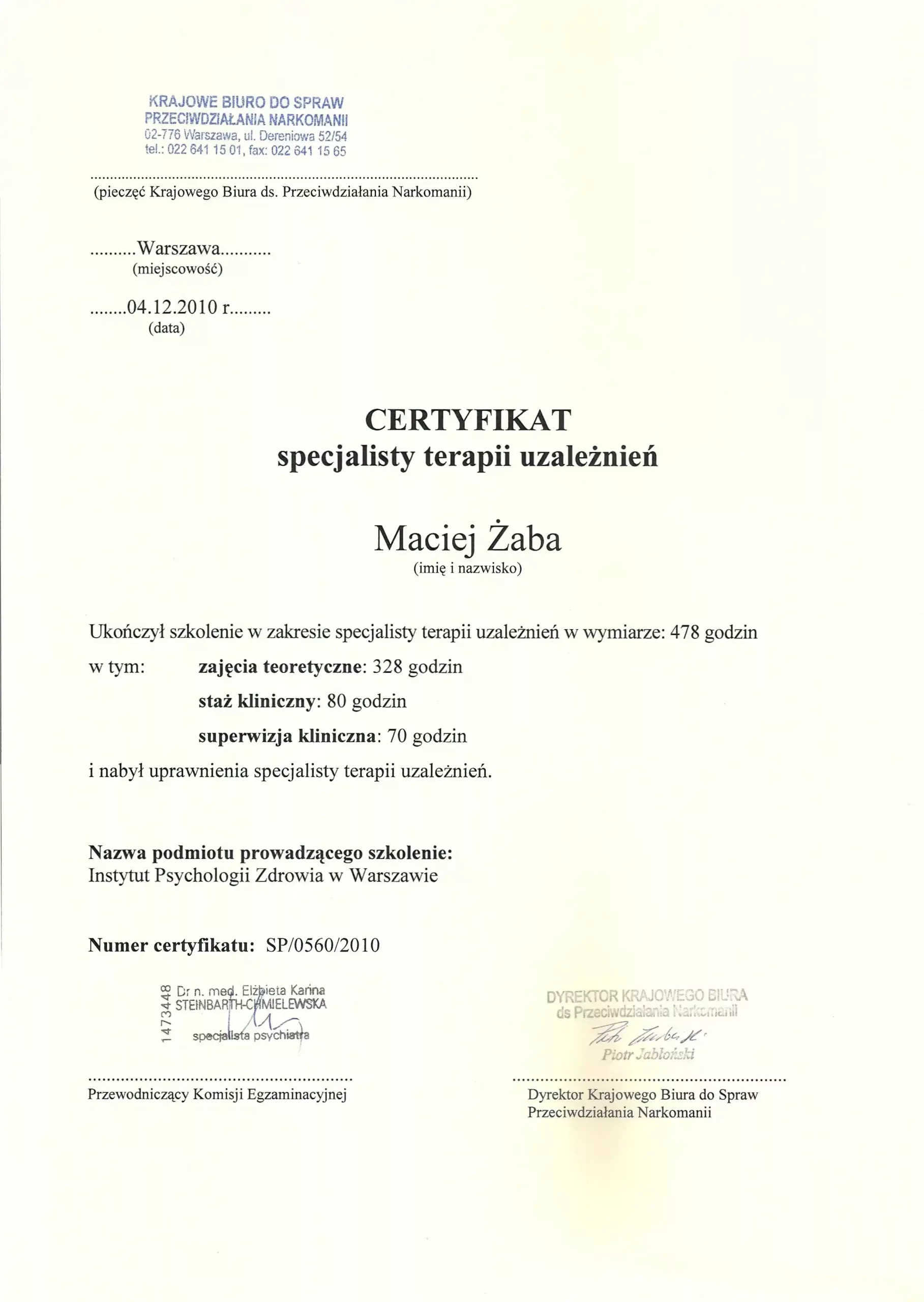 Nazywam się Maciej Żaba, jestem mgr psychologii (2006), certyfikowanym specjalistą terapii uzależnień (2010) oraz psychoterapeutą (2020), w trakcie procesu certyfikacji.