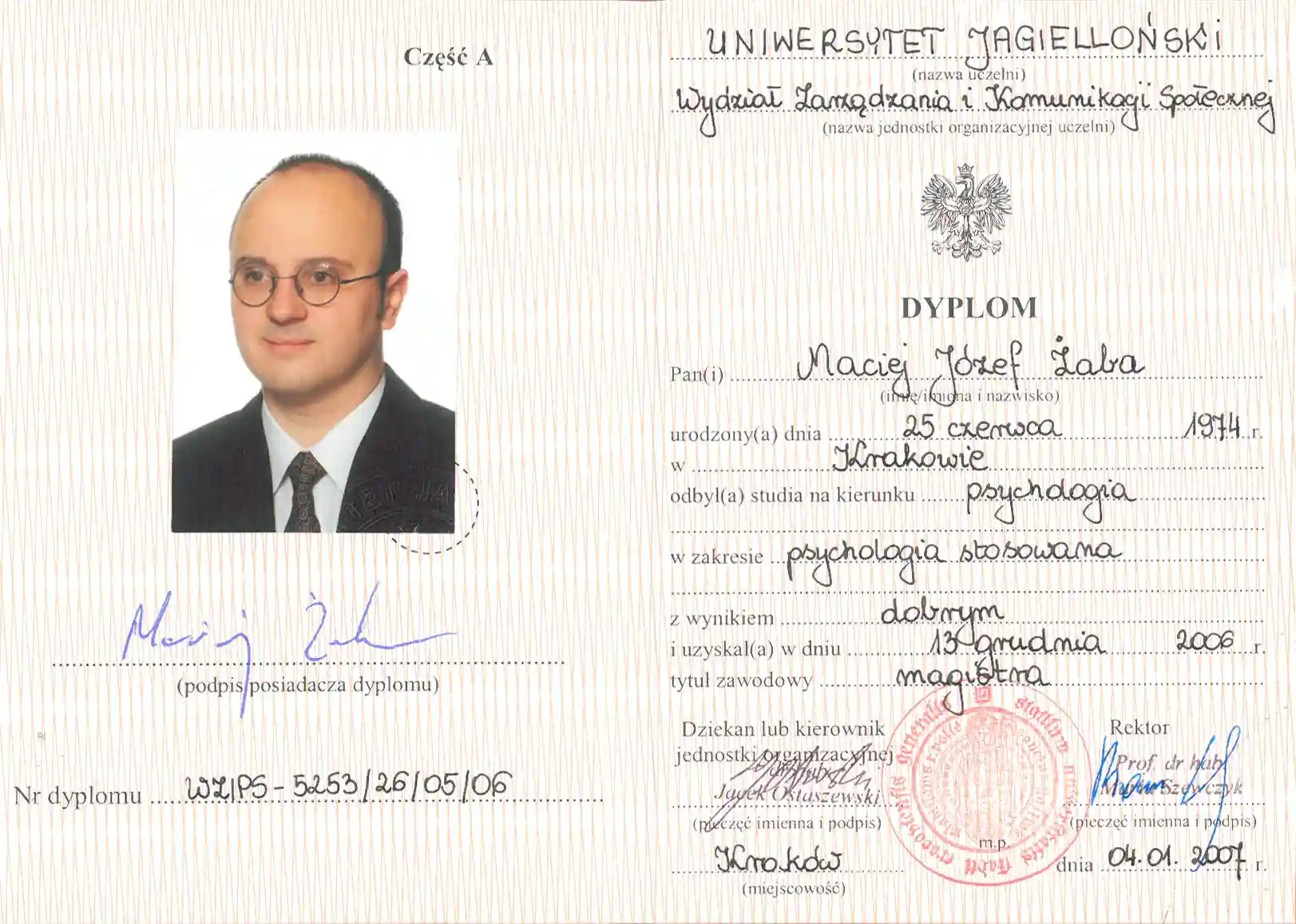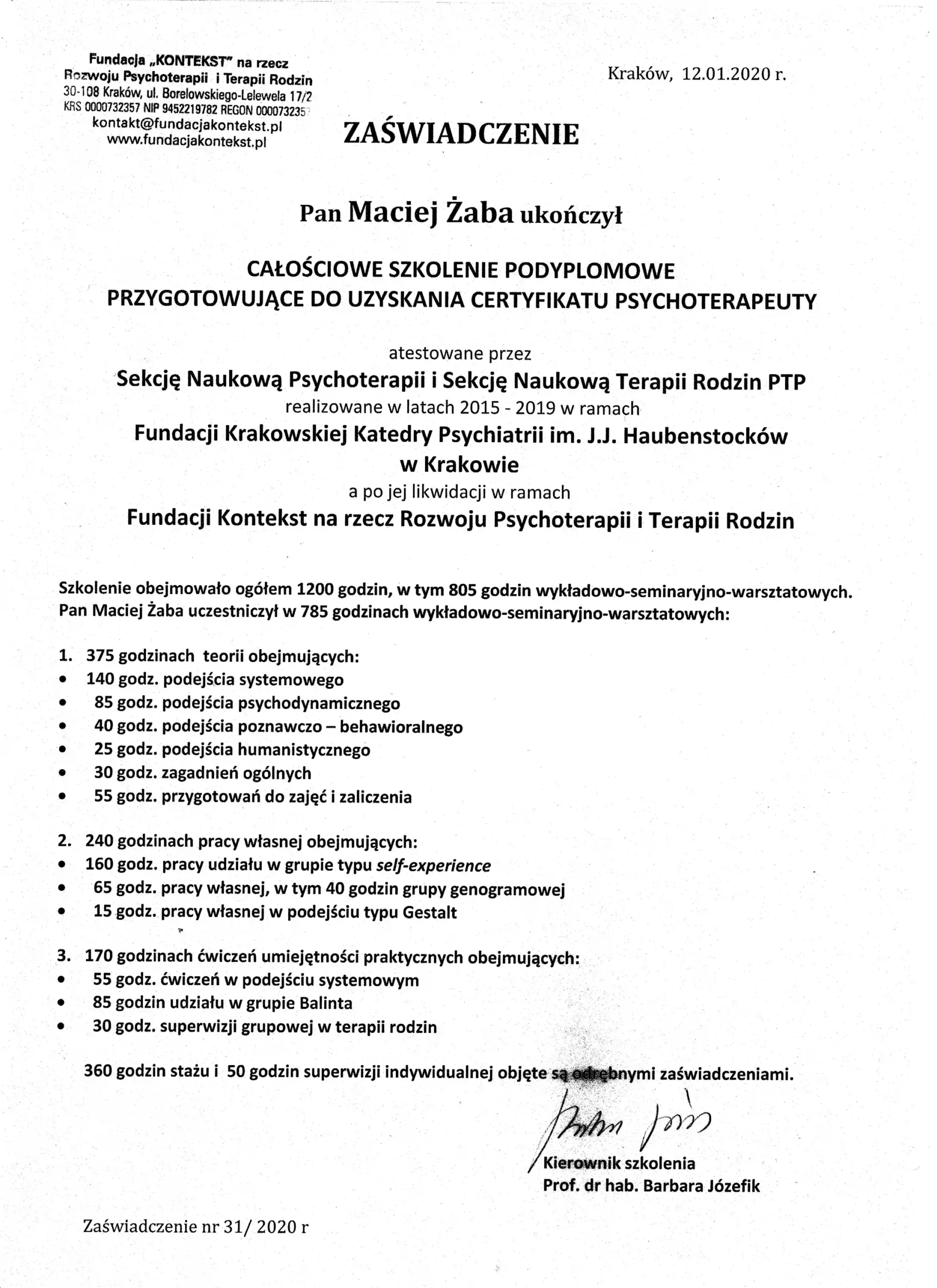 W 2006 roku ukończyłem studia magisterskie z Psychologii Stosowanej na Wydziale Zarządzania i Komunikacji Społecznej na Uniwersytecie Jagiellońskim w Krakowie. W 2010 zdałem egzamin certyfikacyjny na Specjalistę Terapii Uzależnień, po 2,5 letnim szkoleniu w Instytucie Psychologii Zdrowia w Warszawie. W 2020 roku ukończyłem 5 letnie Szkolenie Całościowe Systemowo – Psychodynamiczne w Fundacji Kontekst w Krakowie.